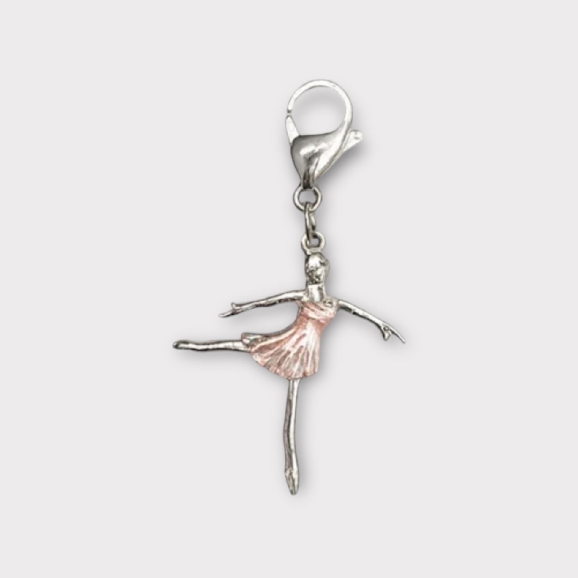 Add a touch of elegance to your everyday style with this delicate ballerina charm. Featuring a soft pink dress and a poised dancer silhouette, it clips easily onto shoes or phone and more. Perfect for dancers, dance moms, or anyone who loves a little sparkle and grace.