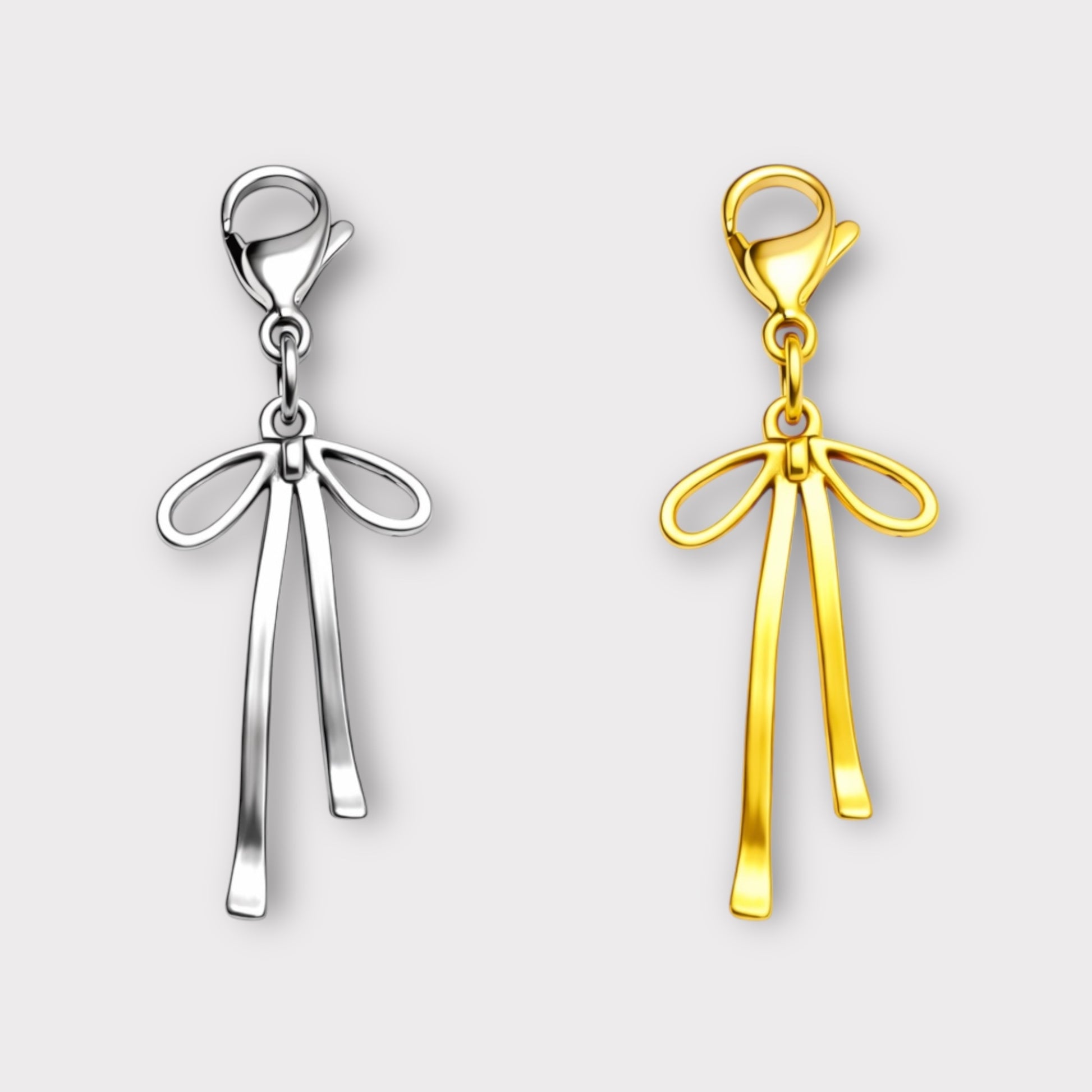 A dainty silver bow charm with a delicate sparkle and flowing ribbon detail—perfect for adding a soft, elegant touch to shoes, bracelets, keychains, or bags.