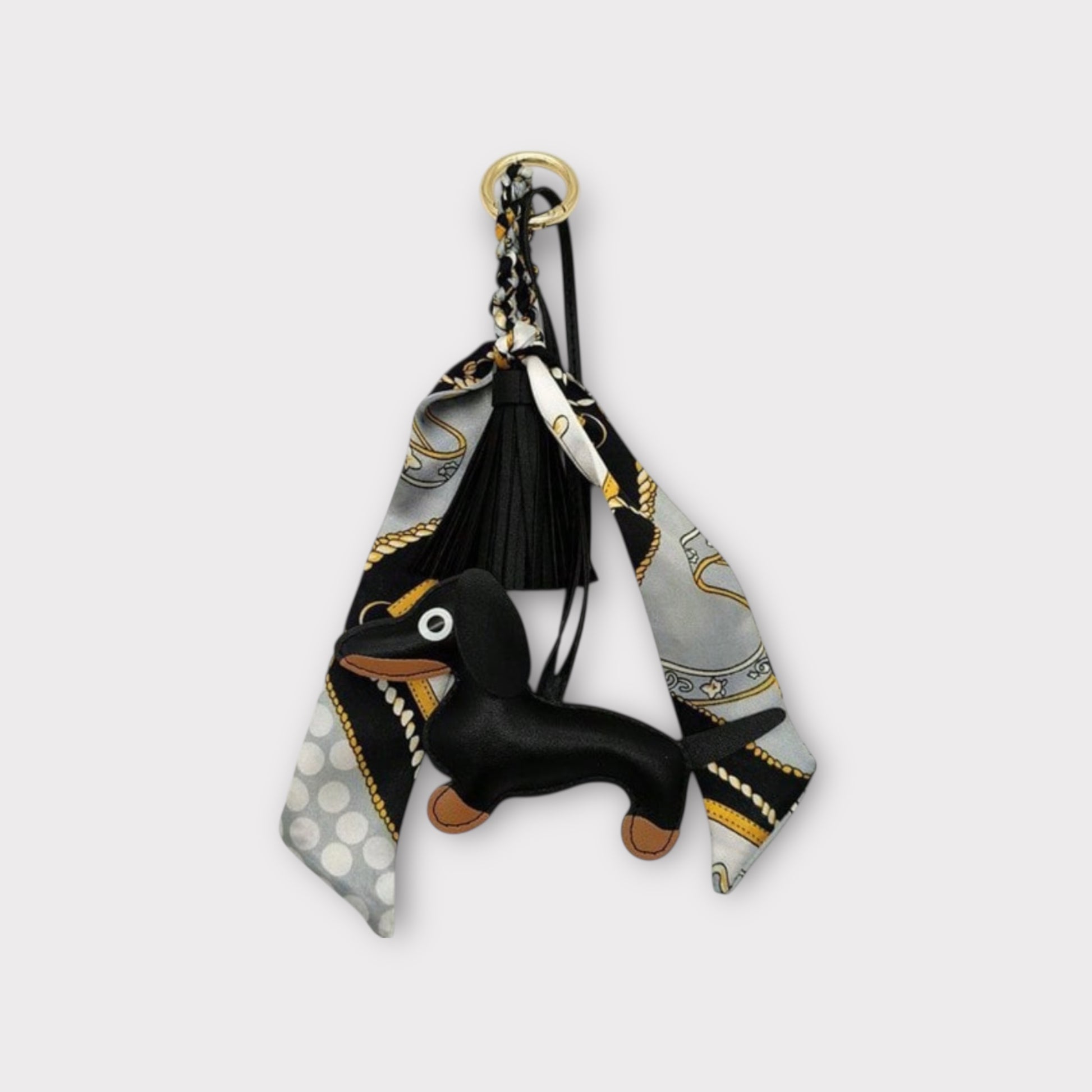 The Dog Bag Charm Set is a playful and stylish accessory featuring a dachshund design with a smooth finish. It comes with a tassel and a decorative scarf detail, adding a chic touch to your bag or keys. Perfect for dog lovers and fashion enthusiasts alike