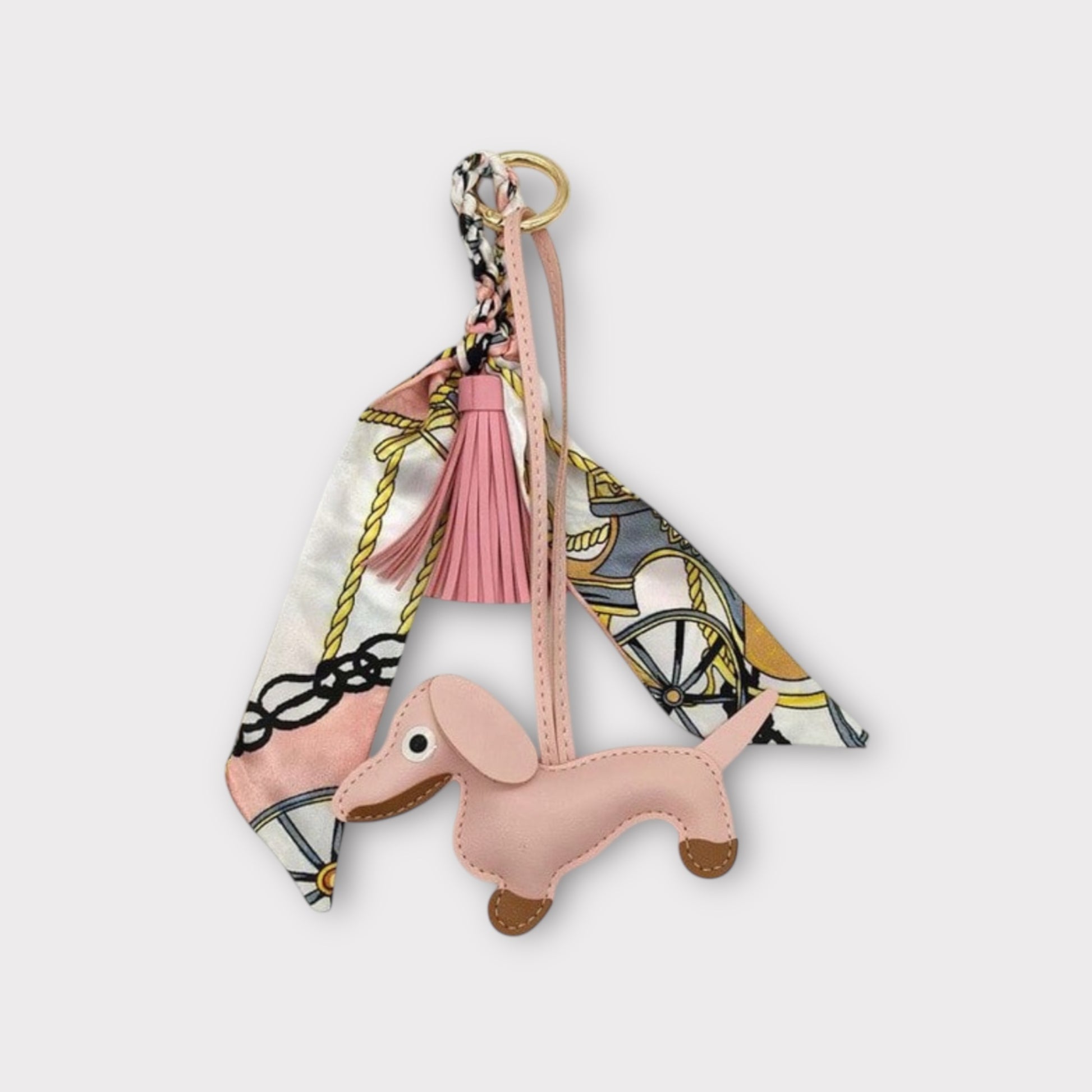 The Dog Bag Charm Set is a playful and stylish accessory featuring a dachshund design with a smooth finish. It comes with a tassel and a decorative scarf detail, adding a chic touch to your bag or keys. Perfect for dog lovers and fashion enthusiasts alike