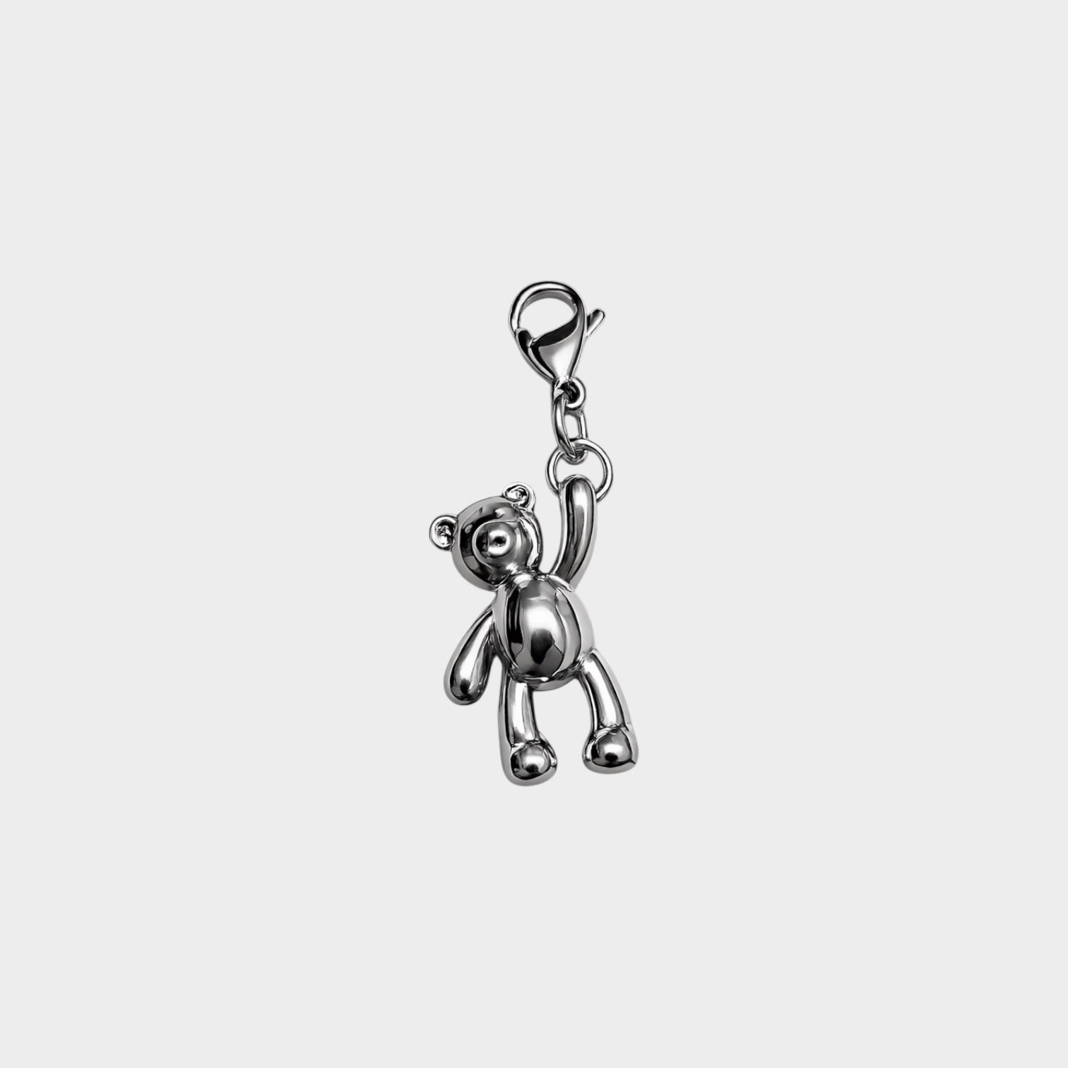 A shiny teddy bear charm with a clip-on clasp—perfect for shoes, keys, or backpacks.