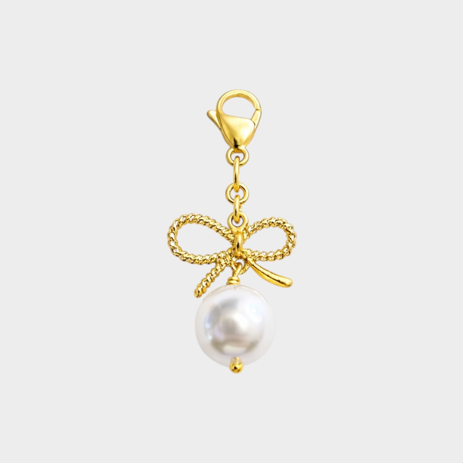 A dainty bow charm with a pearl drop and lobster clasp—perfect for adding a soft, elegant touch to any bracelet, necklace, or keychain.