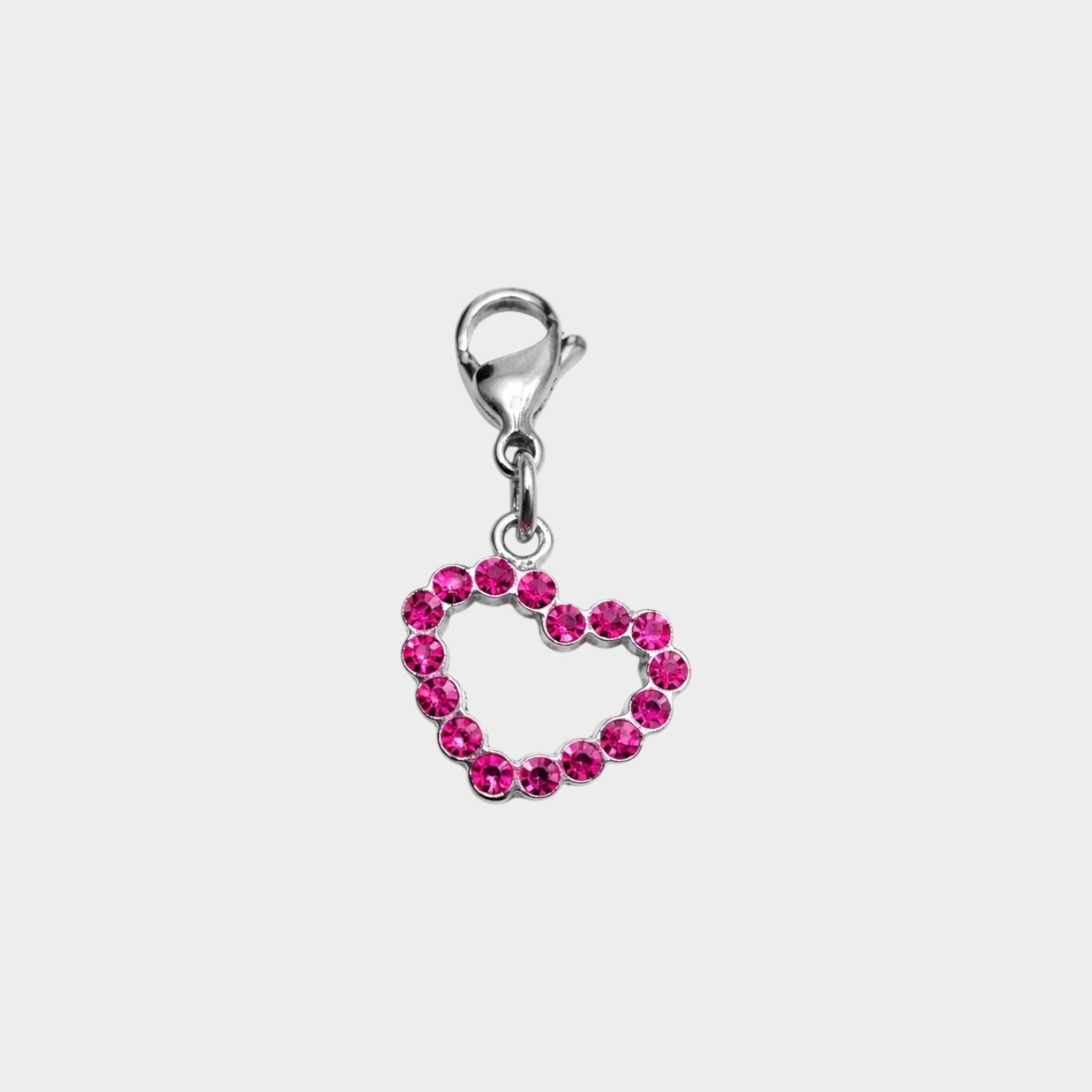Add a pop of sparkle with this open-heart charm lined in bright pink crystals. Finished with a secure clip clasp—perfect for bracelets, keychains, bags, or charm chains.